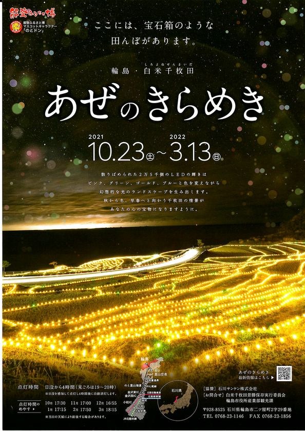 世界農業遺産「能登の里山里海」を代表する1,004枚の棚田・白米千枚田。「あぜのきらめき」はここ、白米千枚田を舞台に開かれるイルミネーションイベントで、今年度は2021年10月23日(土)~2022年3月13日(日)の期間、連日ライトアップされます。田んぼのあぜに25,000個のLEDを設置し、ピンク、グリーン、ゴールド、ブルーと15分ごとに色を変えながら、幻想的な光のランドスケープを生み出します。