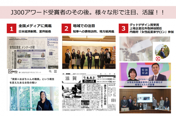 J300アワード受賞後には、知事表敬訪問やメディア取材など、さまざまな広報機会へつながる事例が増えています。また、実績だけでなく、今後の可能性も評価対象とするため、J300アワード受賞を皮切りに、「グッドデザイン賞」「内閣府・女性のチャレンジ賞」など他アワードでも評価・受賞される方が多数。全国で注目されるきっかけにもなるアワードです。
