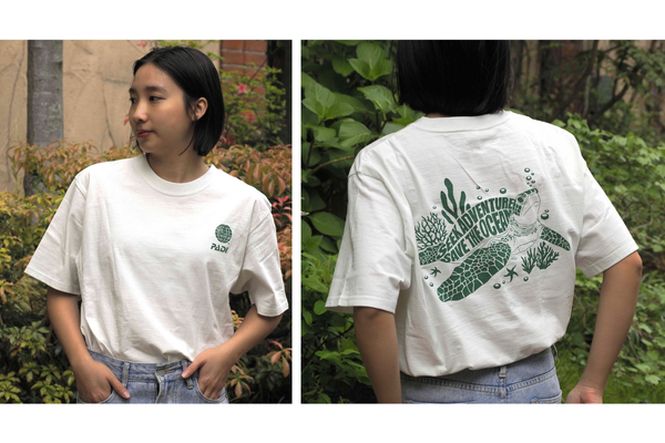 サンゴ礁でゆっくりと休むアオウミガメが描かれているこのデザインはフィンアーティスト YURIE氏によって手掛けられています。そしてこのTシャツに使われているグリーンは、YURIE氏が「常盤の松」をイメージして選んだもの。季節が移ろっても色あせない松の緑には、自然のたくましさと、海を未来へと残していきたいという想いが重ねられています。