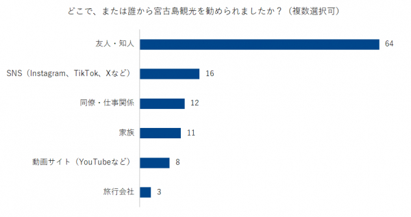 「宮古島観光を勧められたことがある」と回答した方に対し、そのきっかけとなった人物や場所についてたずねたところ、最も多かったのが「友人・知人」で64人でした。次いで、「SNS(Instagram、TikTok、Xなど)」16人、「同僚・仕事関係」12人、「家族」11人、「動画サイト(YouTubeなど)」8人、「旅行会社」3人と続きます。