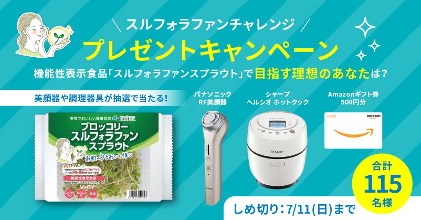 本キャンペーンは、本商品の機能性をお客様に広く知っていただくことを目的とし、スルフォラファンスプラウトを食べてチャレンジしてみたい機能性「#肌のうるおい維持」、または、「#肝臓の健康指標改善」のどちらかをTwitterでお客様にツイートしていただくことでキャンペーン応募ができ、応募者から応募者へとTwitter上で情報が拡散、応募いただいた全てのお客様の中から抽選で115名の皆様へ景品が当たるという内容です。