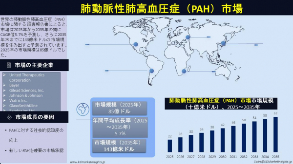 世界の肺動脈性肺高血圧症(PAH)市場に関する 調査報告書によると、市場は2025年から2035年の間にCAGR値5.7%を予測し、さらに2035年末までに143億米ドルの 市場規模を生み出すと予測されています。2025年の市場規模は85億ドルでした。