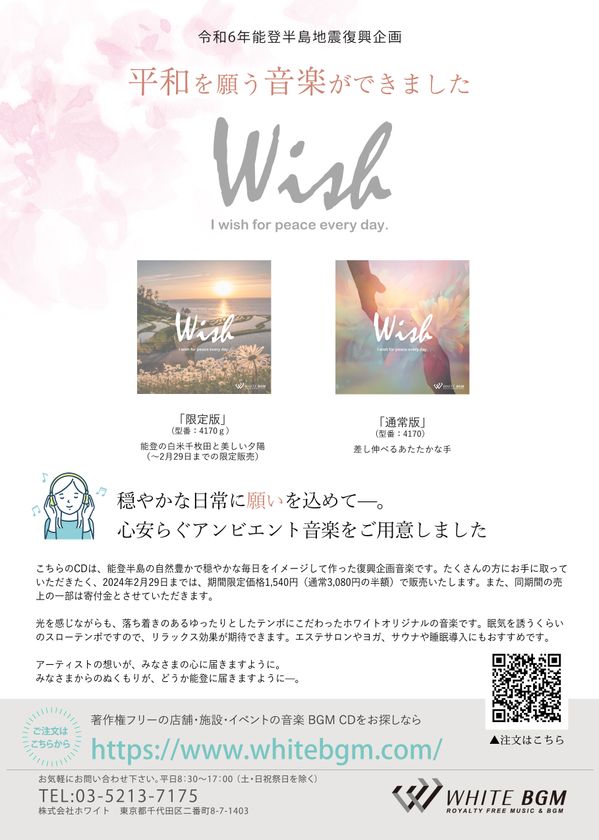 動画制作や店内向けの著作権フリーのBGM事業を行っている株式会社ホワイト(所在地:石川県金沢市)は、この度、令和6年能登半島地震の復興企画として、2月1日に「Wish -I wish for peace every day.-」をCDリリースしました。