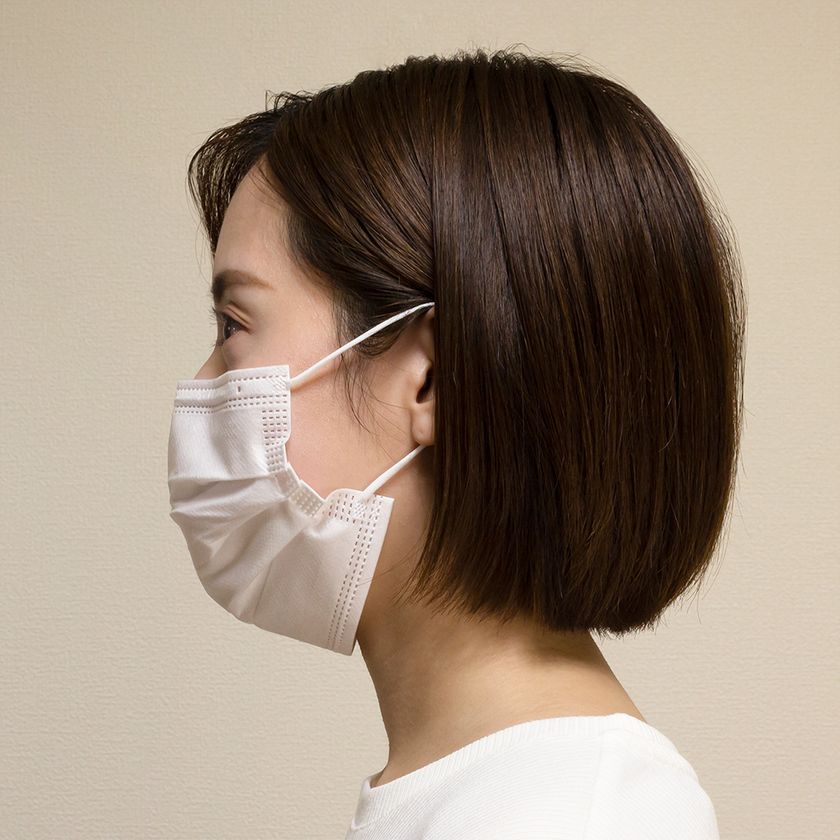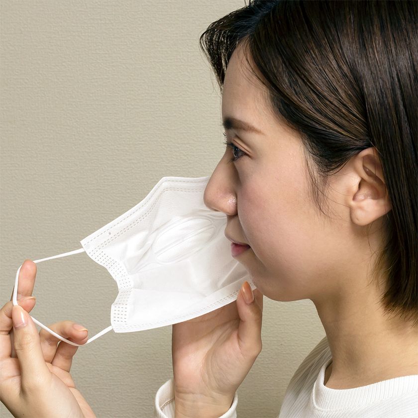 唇にマスクが触れず、マスクスク全体で通気を行えるので話すのがラクになる。またおしゃべりしていてもマスクが下にずれにくくなる。