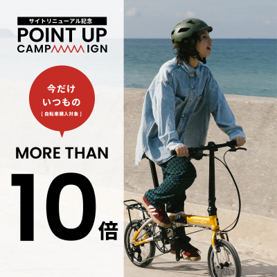 期間中に自転車をご購入いただいた方全員に、通常ポイント付与に加え、+9倍のポイントをプレゼント!購入金額10%以上のポイントが還元される大変お得なキャンペーンです! キャンペーンで付与されたポイントを使えば、ライトなどちょっとした小物もゲットできるかも! ぜひこの機会に欲しかった自転車を購入して、新しい自転車生活を始めてみてください。