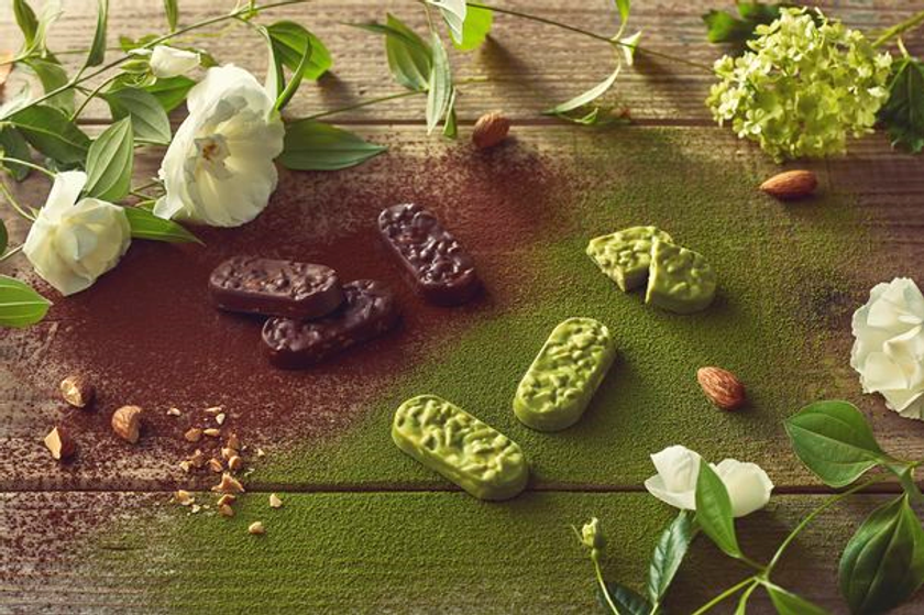ザクザクとした食感のアーモンドとなめらかなチョコをミックスしたクランチチョコレート。ミルクチョコと抹茶チョコの2風味。