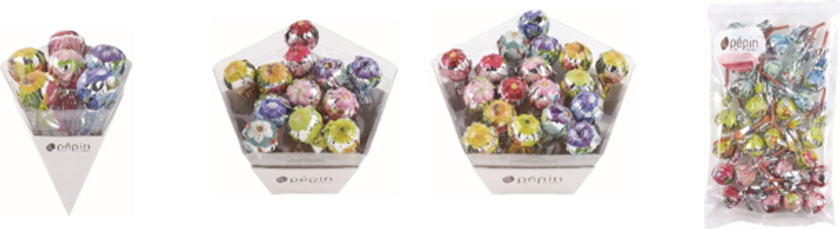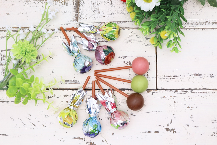自家製ナッツペーストを抹茶・ミルク・ストロベリーチョコでコーティングした、ロリポップ型チョコレート。