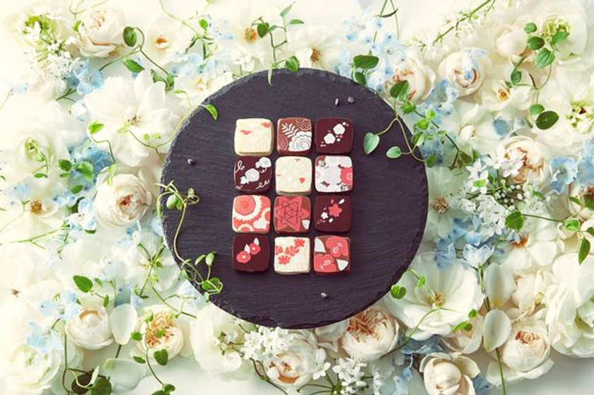フラワープリントが華やかな、柔らかい口どけのガナッシュ。12種類のバラエティ豊かな風味をお楽しみいただけます。