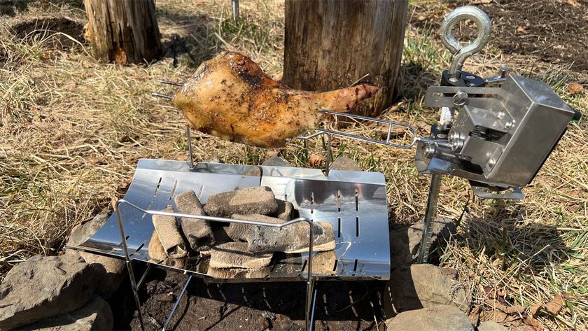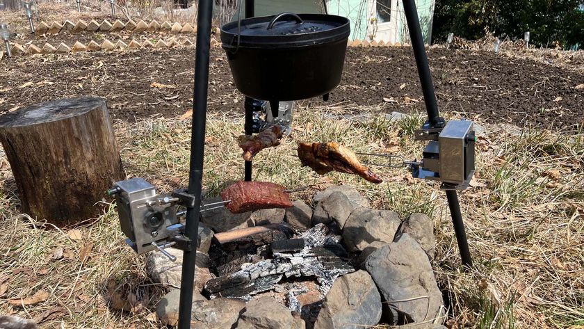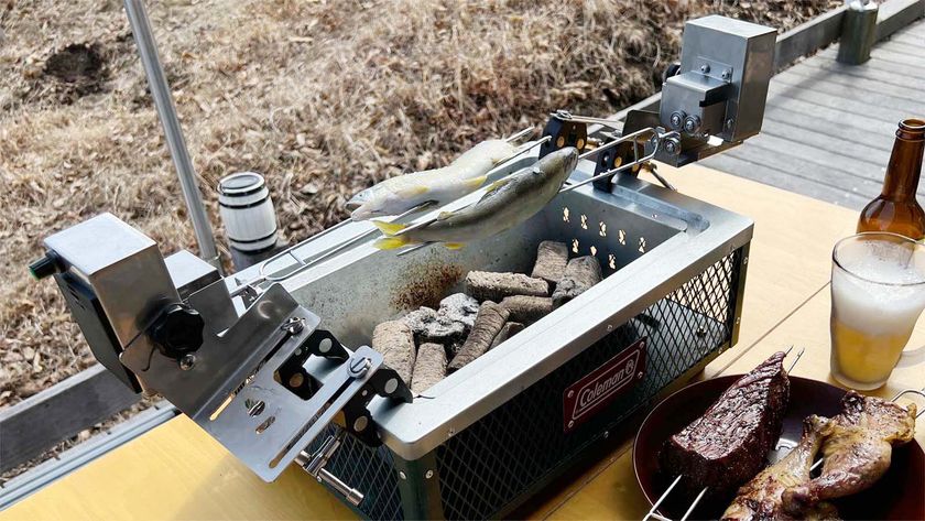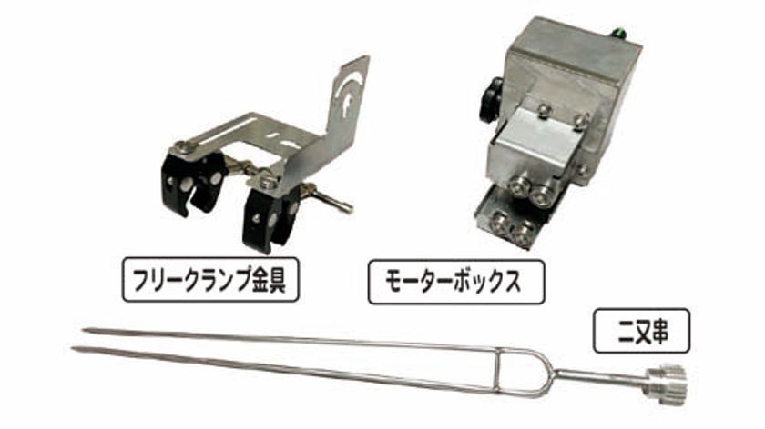 (1) 「ローリングー!」は、バーベキュー串がモーターの力でぐるぐる回り、食材を均等に焼くことができる、ちょっと楽しくて、ちょっと美味しいアウトドアツールです。