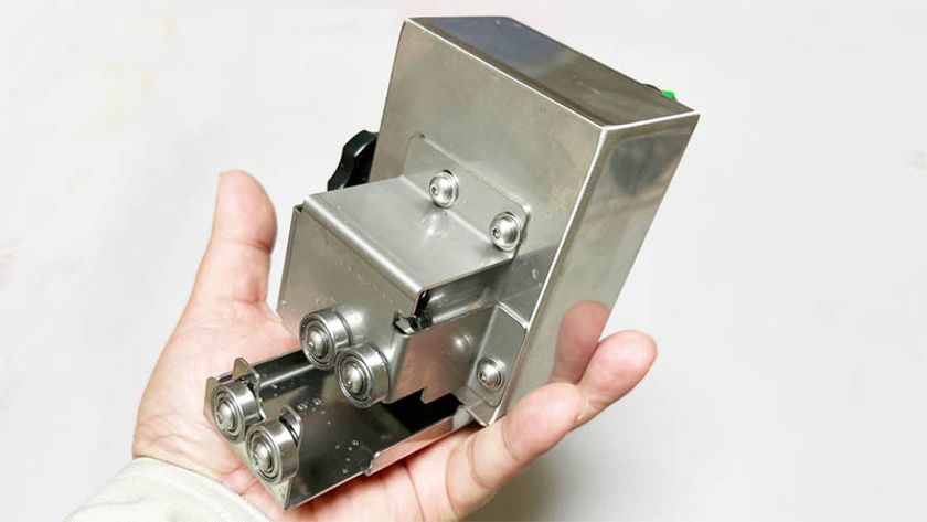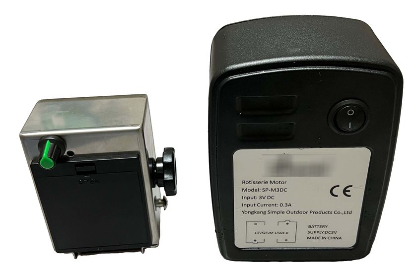 (2) 「ローリングー!」の特徴は、まずそのコンパクトさ。モーターボックスは手のひらに載るサイズです。大手通販サイトでよく見られる、「ロティサリーキット」と呼ばれる、回転式調理器のモーターボックスと比較しても、その大きさの差は一目瞭然です。