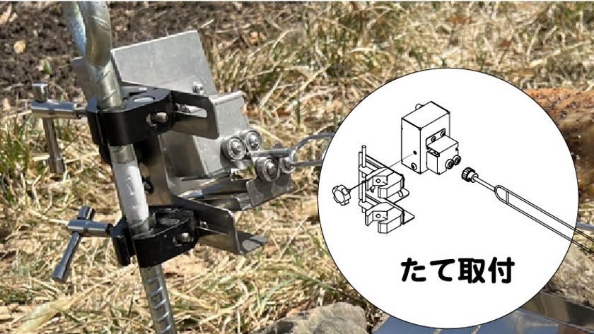 「ローリングー!」の取付は、モーターボックスとフリークランプ金具の組み合わせ方により、(1)よこ取付、(2)たて取付、(3)省スペース取付の3つのパターンがあります。取付場所に合わせて選んでいただけます。