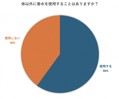 香水の体以外での使用についてアンケートを実施したところ、「使用する」が60%、「使用しない」が40%という結果となり、過半数の人が香水を体以外で使用していることが分かりました。主な使用場所としては、ハンカチやベッドなどが挙げられ、いずれも汗を拭いた後や就寝時など、リラックス効果を意識した使用が多いことが確認されました。