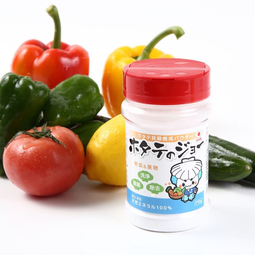ホタテのジョーは水に溶かすことでアルカリ性の水溶液となり、通常の水洗いでは落とすことのできない野菜や果物などの食材の表面に付着している残留農薬、ワックス、防腐剤などの有害物質をたった5~10分つけおくだけで浮かせると同時に、一般細菌、大腸菌、サルモネラ菌などの食中毒の原因菌を除菌・抗菌します。