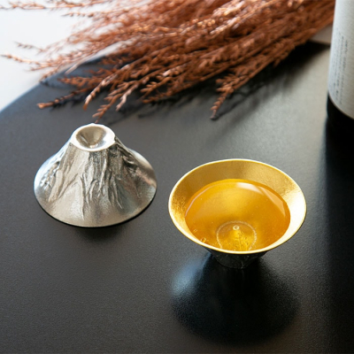 錫(すず)は古来より「錆びにくく抗菌性に優れる」素材として愛されてきました。金沢の伝統技術で施された金箔を組み合わせた特別仕様。富士山の気高い姿を、錫の清らかな輝きと金箔の華やかさで表現しています。