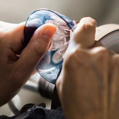 18世紀初頭、中国やヨーロッパから伝来した技術と日本の技術のハイブリッドとして生まれた江戸硝子。伝統技術によりガラス製品を手がける「中金(なかきん)硝子総合株式会社」は、1946年(昭和21年)創業以来、2色のガラスを重ねて吹く「中金色被せガラス」を主に製造、江戸硝子の普及に努めています。職人がつくる二層のガラス「色被せ硝子」を使用し、切子模様を施す実演を行います。