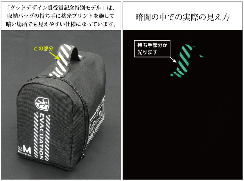収納バッグの持ち手部分に蓄光プリントを採用。暗い場所でも見つけやすくしました。