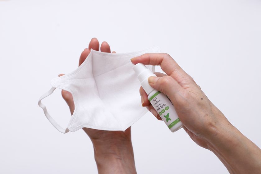 噴射口をマスクに向け、適量(1~2プッシュ)をマスクの外側・内側にスプレーしてください。スプレーしたマスクは軽く振るなどしてよく乾かした後に装着してください。