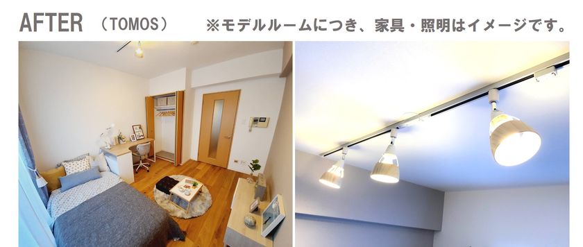 中でも、グッドルームの「TOMOS」を導入した住戸は、本物の木を使用した無垢材のフローリングで温かみがある仕上がりです。また、全戸、照明には可動式のライティングレールを設置し、角度や位置を自在に変えることができるようになります。ほか、キッチン・洗面台のダイノックシートの貼り替えやエアコン交換も行い、洗濯機置き場や冷蔵庫置き場の上部には収納棚を新設します。