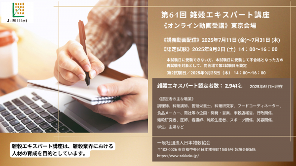 今回の第64回講座では、利便性の高いオンライン動画視聴と所定会場での認定試験を組み合わせたハイブリッド形式で実施します。オンライン講義動画はインターネット経由で配信され、受講者は期間内に繰り返し視聴して学習可能です。修了後、東京会場での認定試験に合格することで「雑穀エキスパート」資格が認定されます。
