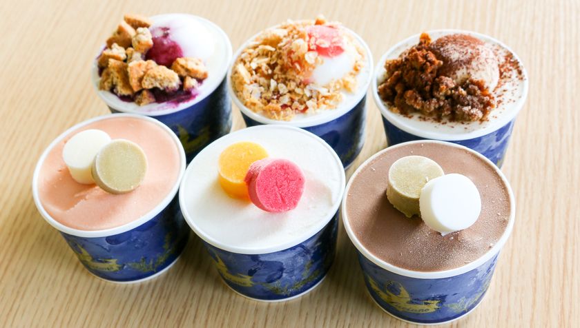 洋菓子をイメージした3つのジェラートは、「ティラミス」がレアチーズジェラートとコーヒーシロップ漬けのスポンジ生地、ココアパウダーの組み合わせ、「イチゴミルフィーユ」がミルクジェラートとパイ生地、自家製イチゴソース、「ベリーレアチーズケーキ」はレアチーズジェラートとクランチクッキー、自家製ベリーソースの組み合わせで、こちらも層にすることでジェラートと混ざりすぎることなくよりケーキに近い食感で召し上がっていただけるよう仕上げました。