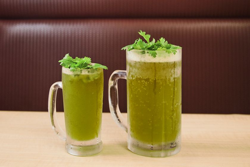 ●ほうれん草エキスに生ビールを注ぎ、泡の上に山盛りパクチーを浮かべたアイアン系グリーンビール。