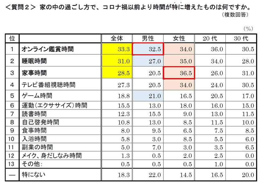 最も増えたのは、映画・音楽・演劇などの「オンライン鑑賞時間」(33.3%)でした。以下、「睡眠時間」(31.0%)、料理・洗濯・掃除などの「家事時間」(28.5%)、「テレビ番組視聴時間」(27.3%)、「ゲーム時間」(18.8%)と続きます。