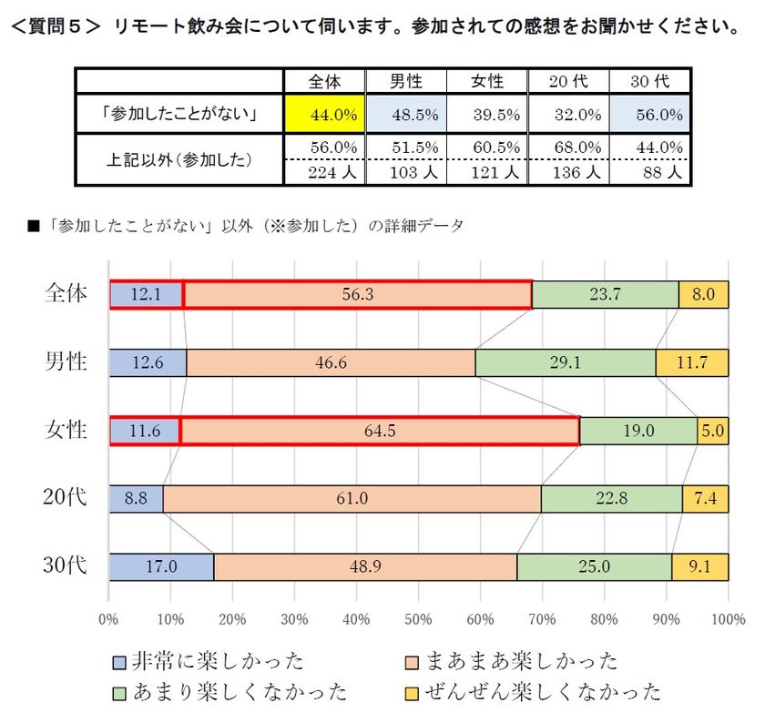 ・リモート飲み会、4割超が「参加したことがない」参加した人の7割は“楽しかった”