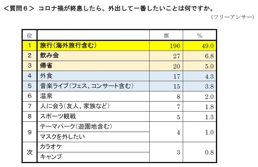 その他は、2位は「飲み会」(6.8%)で、以下「帰省」(5.0%)、「外食」(4.3%)、「音楽ライブ」(3.8%)という結果でした。