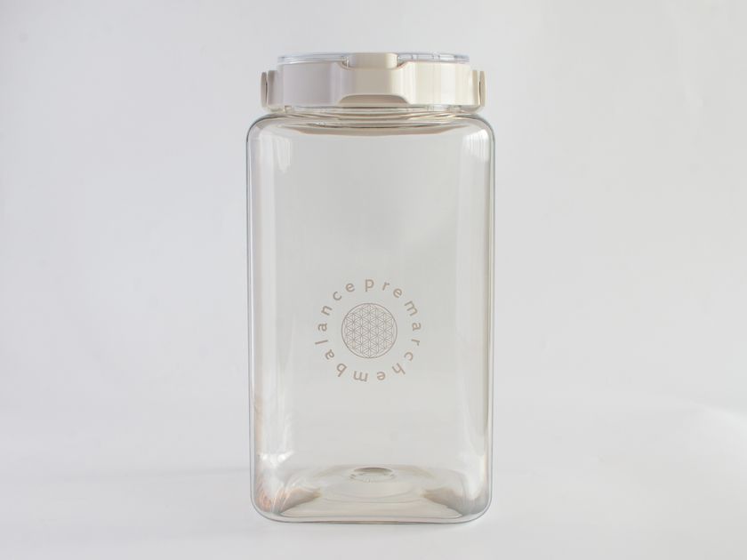 エンバランス加工を施した容器の前面に生命エネルギーのシンボル「フラワーオブライフ」のマークをプリントしました。フラワーオブライフは宇宙の有象無象や生命の根源を表す幾何学模様で、強いエネルギーを持つとされています。
