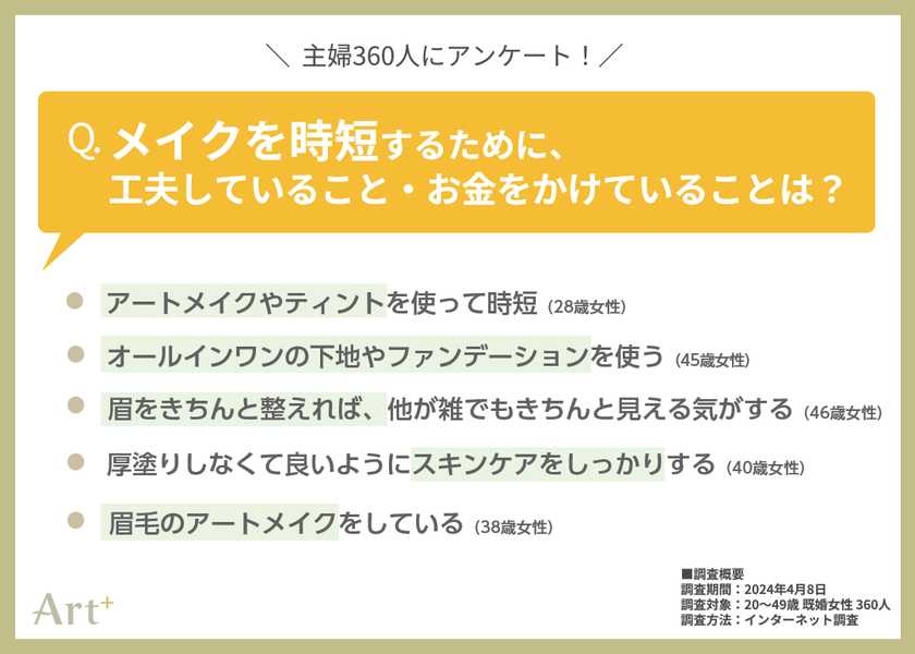 今回の調査では、多くの主婦が「日々のメイクを時短したい」と考えていることや、メイクに関してさまざまな工夫をしていることがわかりました。今後もArt+は、忙しい日々の中でもキレイを叶えられるような情報について発信をしてまいります。