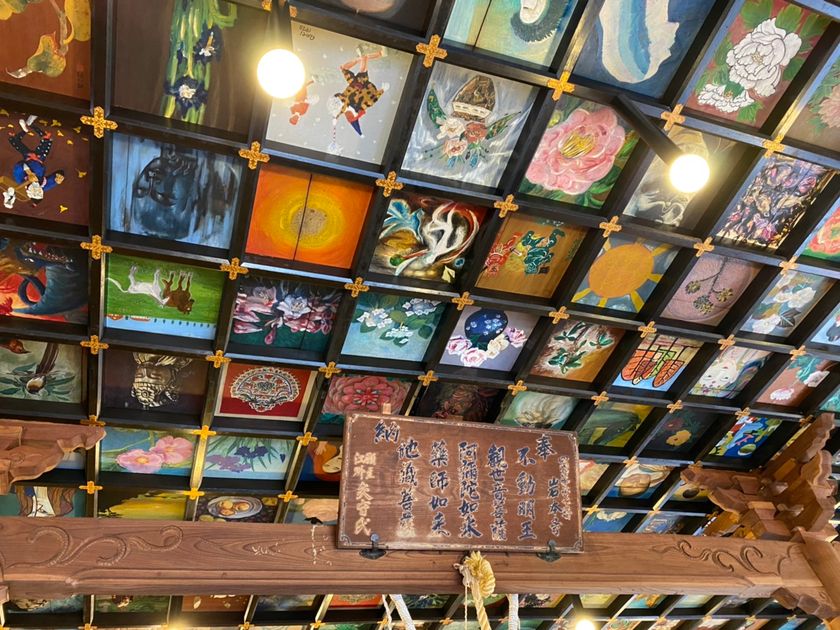 岩本寺の名物とも言われる天井画。本堂には檀家さんや公募で募集した575枚の和洋折衷の絵が、また清流殿には四万十川に架かる沈下橋の絵が天井に飾られています。西洋画あり、水彩画あり、日本画ありと、個性豊かな天井画は圧巻の見応え。マリリンモンローと龍が同じ空間にあるのも興味深いところです。こちらの絵は先代が40年前に行った取り組みであることから、革命寺のルーツをうかがい知ることができます。