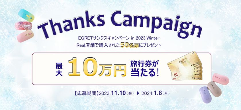 ビジネスハーモニー株式会社(本社:東京都大田区、代表取締役社長:趙 節冰)は、自社開発したおしゃれ且つ高機能のマウス「EGRET」を2023年5月に発売以来、半年間で200以上の店舗で販売することとなりました。これを記念し感謝の気持ちを伝えるべく、「EGRETサンクスキャンペーン in 2023.Winter」を2023年11月10日(金)~2024年1月8日(月)に開催いたします。抽選で実店舗でご購入された50名様に10万円の旅行券など豪華賞品が当たります。