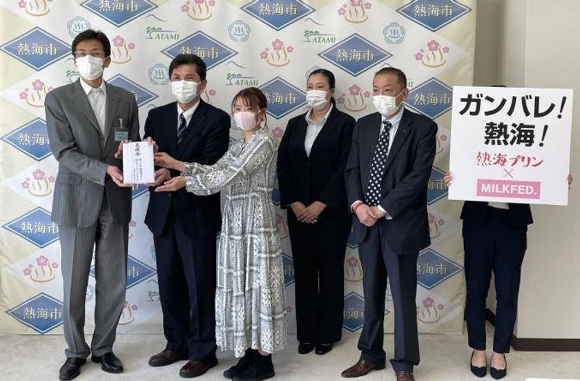 2021年7月30日(金)より「熱海プリン」と、若い女性を中心に人気のファッションブランド「MILKFED.」(株式会社ビーズインターナショナル)は、コラボレーション企画を実施しておりました。今回、コラボレーションの企画段階において発生した熱海市の災害被害を鑑み、この企画が支援の一助となればという想いから売上金の一部を義援金として寄付させていただくこととしており、この度、コラボ商品の店頭販売、ネット販売が全て終了となりましたので、皆さまからお預かりした寄付金を代表して熱海市の市長へお渡ししました。