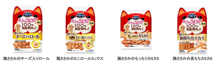 『グラン・デリきょうのごほうび』シリーズのパッケージのデザインを、100%国産鶏肉を使用し、安心して与えられるおやつであることがより伝わりやすいように改良し、発売します。