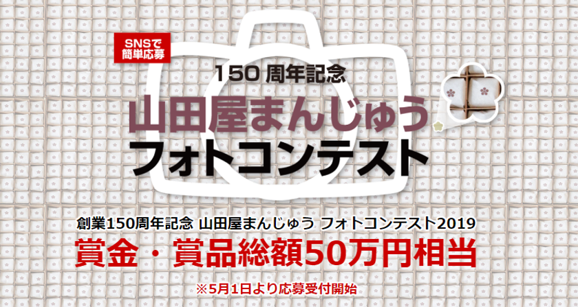 山田屋まんじゅうを製造・販売する株式会社山田屋(本社:愛媛県松山市、代表取締役/五代目当主:高辻 元(※))は創業150周年を記念し、山田屋が販売する商品や山田屋に関連するものを対象とした「山田屋まんじゅうフォトコンテスト」を2019年5月1日(水)~7月31日(水)の期間に開催します。