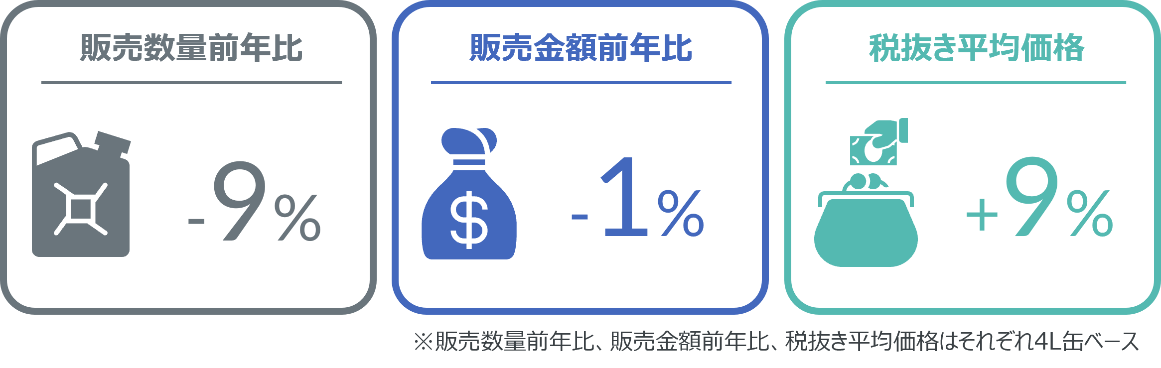 2023年10月の自動車用エンジンオイル販売は、販売量(リットル換算)ベースで前年比3%増と微増であった。しかしながら4L缶の販売は数量前年比9%減であった。これは店頭が同10%減と販売を落とした影響が大きく、インターネットでは同4%増と前年同月を上回った。4L缶の主要な粘度では、0W-20が数量前年比6%減、5W-30が同9%減としたものの、0W-16は同13%増と二桁成長を見せた。4L缶の税抜き平均価格は4,189円と前年同月から9%上昇し、店頭では10%、インターネットでは4%上昇した。平均価格が上昇したことで4L缶全体の金額前年比は1%減に留まった。店頭では金額前年比1%増であったことに対し、インターネットでは8%増と前年を上回った。
