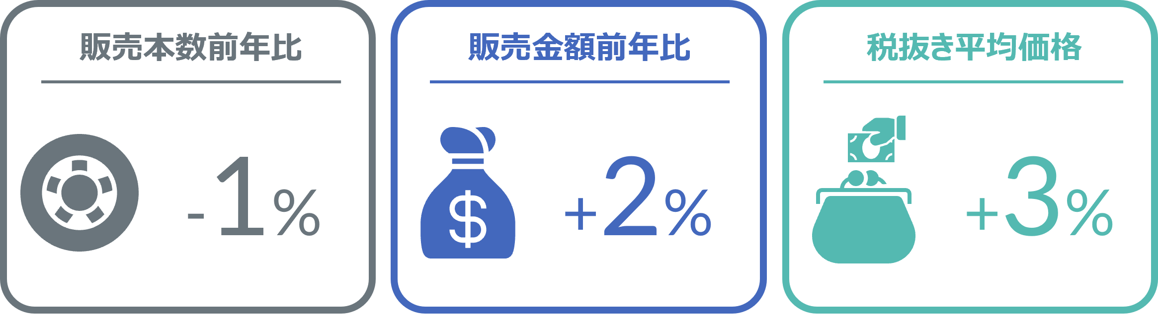 2023年10月の自動車用タイヤ販売は、本数前年比1%減と微減であった。店頭では同9%減であったことに対し、インターネットでは同10%増と堅調であった。夏タイヤの本数前年比は2%減と微減であったものの、冬タイヤの本数あ前年比は0.3%減とほぼ前年並みの水準となった。タイヤ全体の税抜き平均価格は11,586円と前年同月から3%上昇し、店頭では7%上昇、一方インターネットでは1%下落した。本数前年比は前年を下回ったものの金額前年比は2%増と微増となり、店頭では3%減、インターネットでは9%増であった。