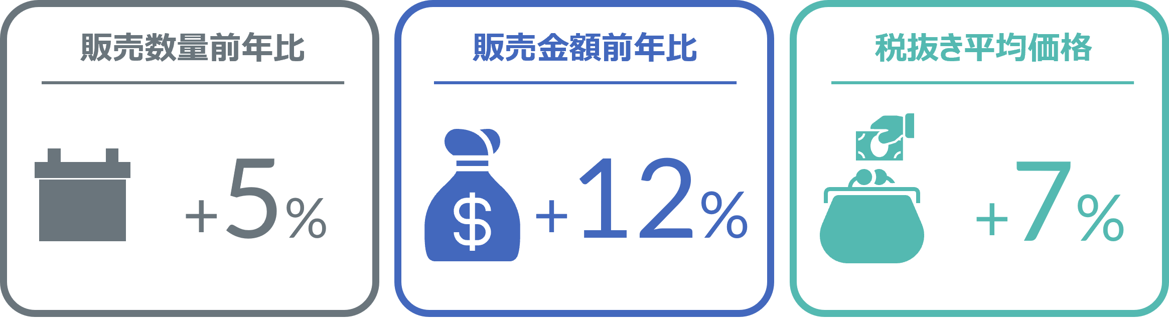 2023年10月の自動車用バッテリー販売は数量前年比5%増と微増であった。ただ、これはインターネットが数量前年比20%増と伸長したことによる影響が大きく、店頭では同3%減であった。JIS規格別では、D26が数量前年比30%増、D23が同12%増と比較的サイズの大きいバッテリーの拡大が見られた。バッテリー全体の平均価格は前年同月から7%上昇し14,002円となり、店頭では9%、インターネットでは6%上昇した。金額前年比は12%増と二桁成長を示し、店頭では同6%増、インターネットでは同27%増に至った。