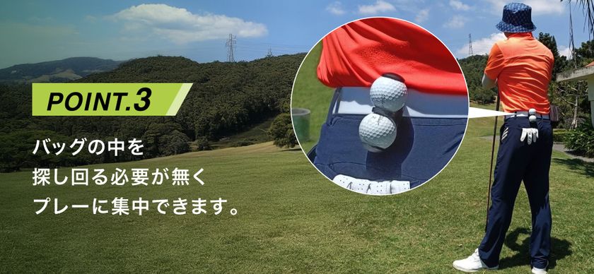 CoCoClipは、ベルトやゴルフバックに装着するタイプのゴルフボールホルダーであるため、プレー中ゴルフボールを探し回る必要がなく、プレーに集中できます。