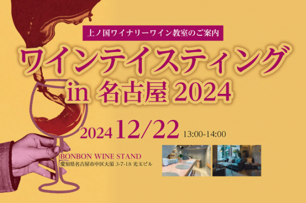 2024年12月22日(日)、上ノ国ワイナリーのワインが 名古屋 大須にあるワインバー BONBON WINE STAND様 にて、「ワインテイスティング2024in名古屋」を開催します。