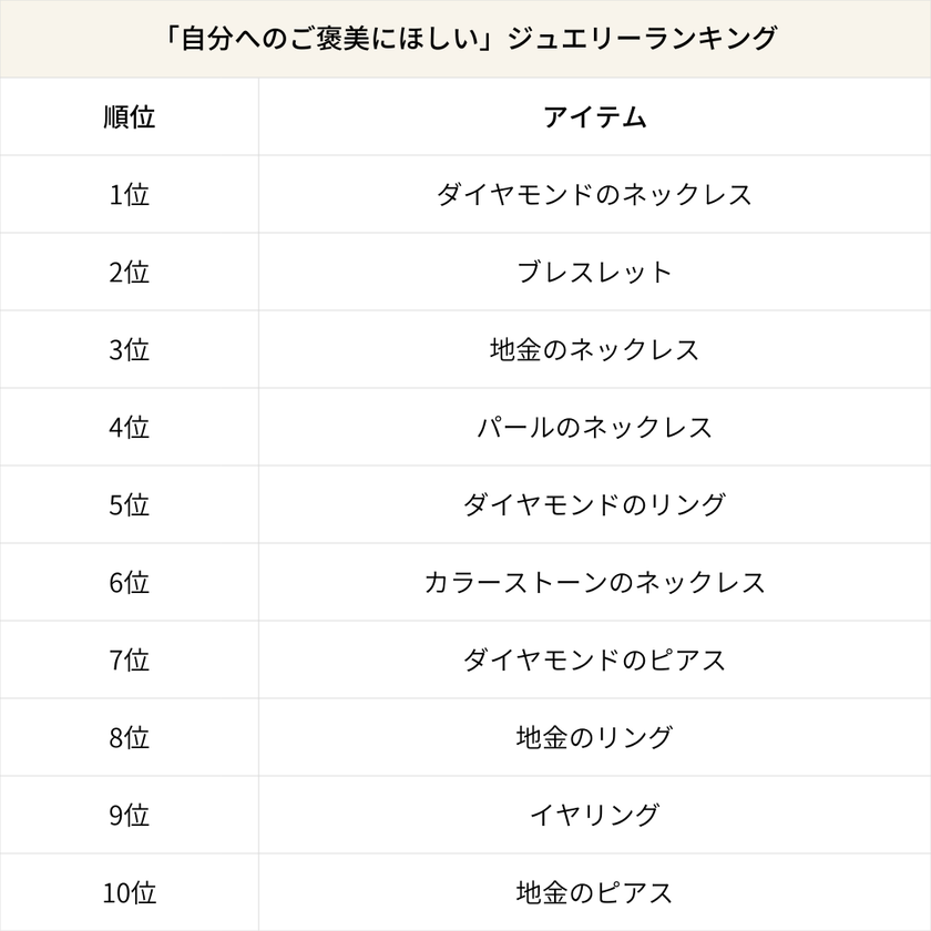 一方で、ダイヤモンドのリングやカラーストーンのネックレスなど、特別感のあるアイテムも上位に入りました。