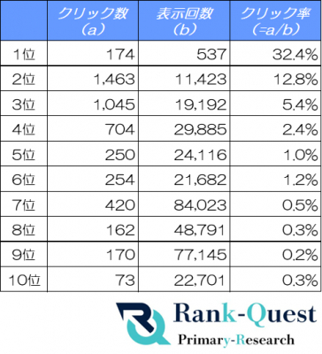 対象キーワードは、2025年9月中にランクエストサイトで検索結果1位から10位に掲載されたものに限定し、各順位ごとのクリック率を分析しました。