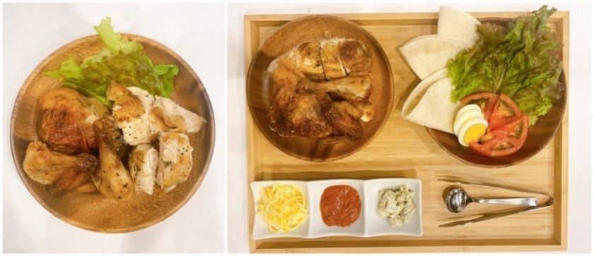 配送メニュー「グレイトチキン」丸鶏プラ容器タイプ(左)とカット済みプラ容器タイプ