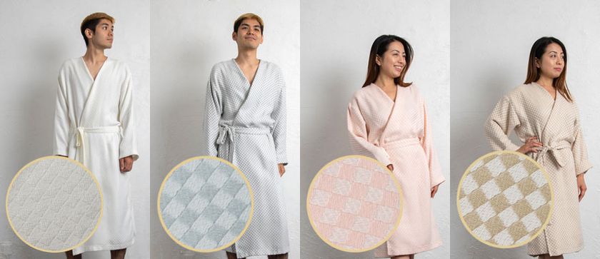 以前よりたいへんご好評をいただいておりました「今治産わた音シルキーフードローブ」を、この度デザインをリニューアルして販売いたします。新作の「今治産わた音シルキーローブ」は、胸元がシンプルなローブで、軽くて肌触りが良く、吸水性に優れた「わた音」という生地を素材に、当社の山形工場にて制作しております。オリジナルカラー4色のバリエーションとなります。