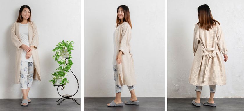 バスローブとして入浴後に!ルームウェアーとしてカーディガンとしても!また、軽くてコンパクトなので、旅先にもお持ちいただける、便利なローブです。