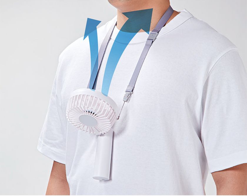 「ハンディファン」(KPF-0904/P・A・W)は、便利なストラップやベルトホルダーが付属しており、手持ちできるだけでなく、ストラップで首からかけたり、ベルトなど腰回りに装着して使用することができる3WAYタイプのミニサイズ携帯ファンです。本体の首が曲がることでファンの角度を調節でき、首からかけたりベルトに装着する際に便利です。その他のUSB充電式のコードレス、風量3段階調節、充電時間等はKPF-0903機種と同じ特徴をもたせています。