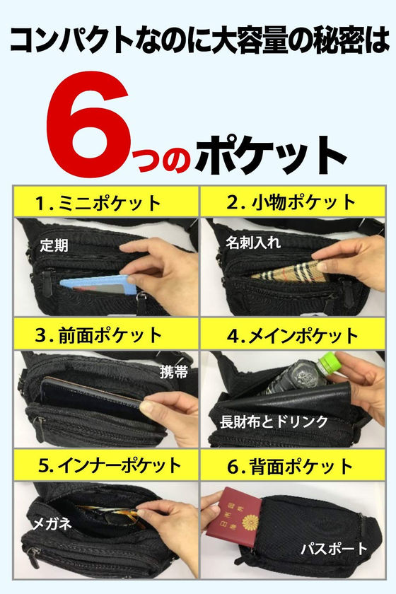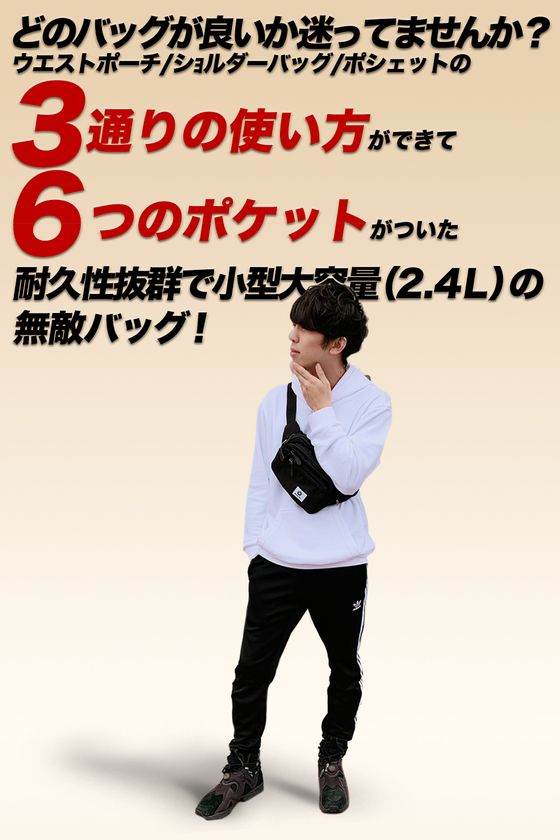 6つのポケットでコンパクトなのに大容量(2.4L)!耐久性抜群で3通りの使い方ができる「無敵バック」の累計販売個数が10,000個を突破!