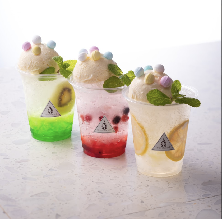 パティシェ・ショコラティエ辻口 博啓が手掛けるFARM to BARショコラブティックの2Fカフェでプチガトーと共に、アルプスの恵みから培われる透き通る天然水を使用し、美しく芳醇な味わいのシロップとアクセントにレインボーラムネミニで飾り、季節を感じる爽やかで色鮮やかなル ショコラ ドゥ アッシュ オリジナルのクリームソーダをお楽しみいただけます。