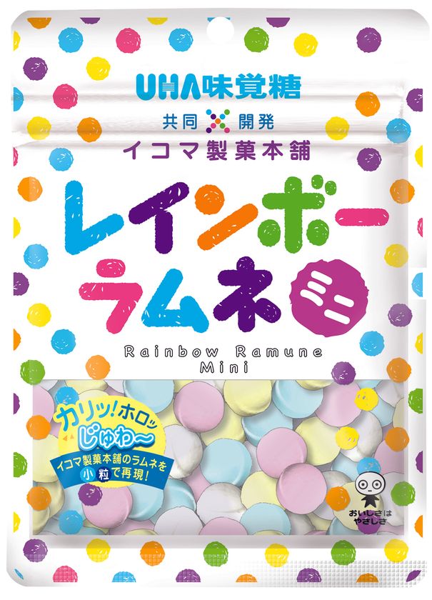 レインボーラムネミニは、奈良県生駒で“行列に並んでも買えない”レインボーラムネを、製造元であるイコマ製菓本舗とUHA味覚糖が共同開発したものです。オリジナルの魅力でもある「カリッ!ホロッ、じゅわ~」という食感を活かし、門外不出のレシピを本家のおいしさはそのままに小粒でかわいく仕上げたミニラムネです。