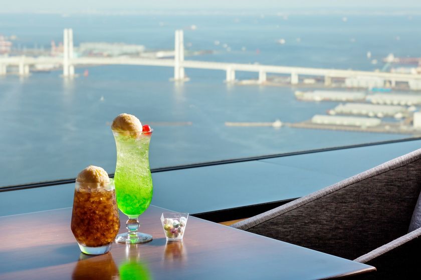 みなとみらい横浜ランドマークタワー70Fのラウンジから横浜港を見下ろすロケーションで爽快感とともに懐かしさが味わえるクリームソーダとコーラフロートに、レインボーラムネミニを自由にトッピングできる。ディナータイムは、それぞれをカクテルスタイルで登場。